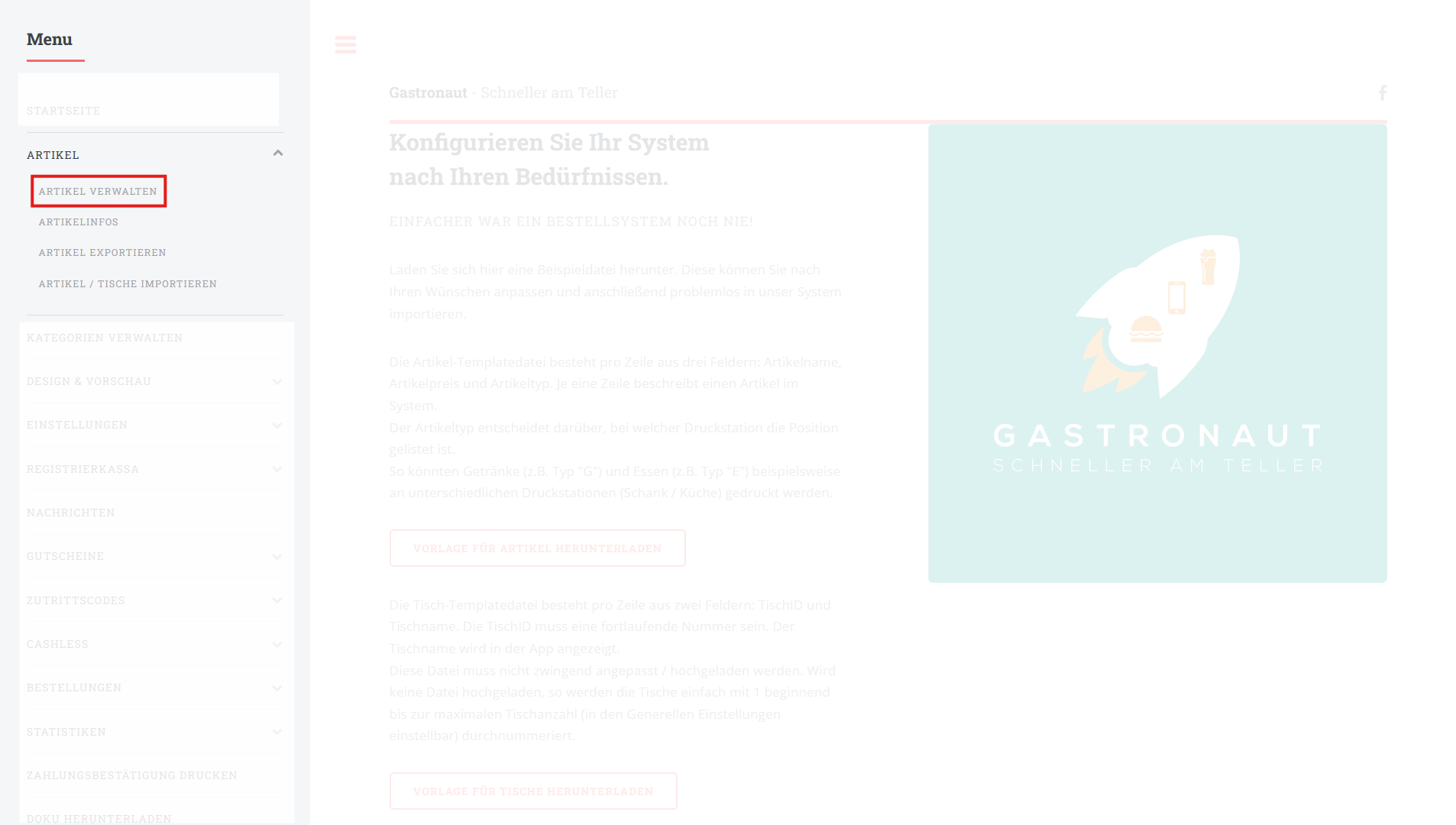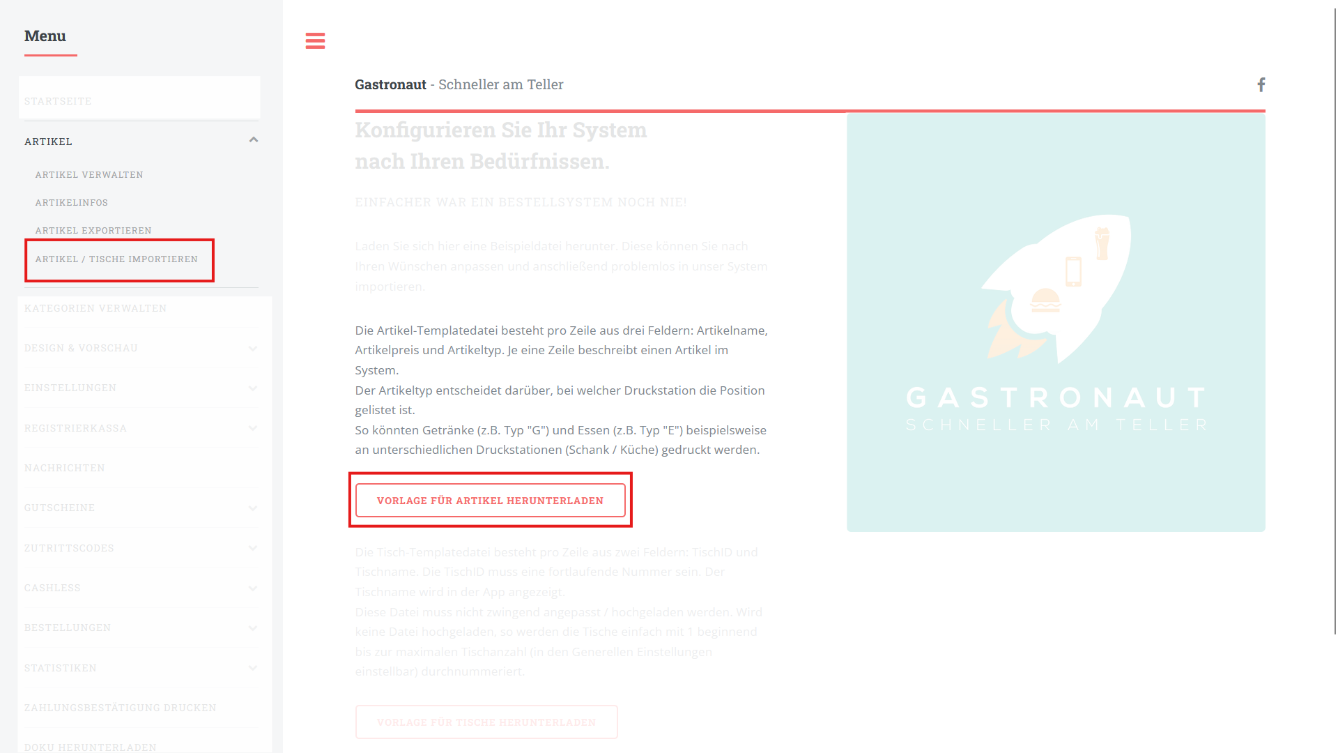 Die schnellste Möglichkeite Ihre Artikel in Gastronaut zu importierten ist via Excel-Liste. Dazu können Sie sich die Vorlage von der Startseite herunterladen und in diesem Schema Ihre Artikel gestalten. In diesem Beispiel wird die Vorlage importiert.