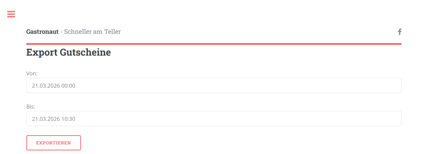 Auf der Seite können Sie eine Übersicht der angewendeten Gutscheine exportieren. Es muss ein Zeitraum (Von-Bis) angegeben werden, für den die Übersicht exportiert werden soll. Mit Click auf "Exportieren" wird eine Excel-Liste heruntergeladen, in der Sie Informationen zu den eingelösten Gutscheinen sehen können. Wichtig: Damit der Export funktioniert, muss in den generellen Einstellungen die Option "Rechnungen nach dem Kassieren an den Server senden" ausgewählt werden.