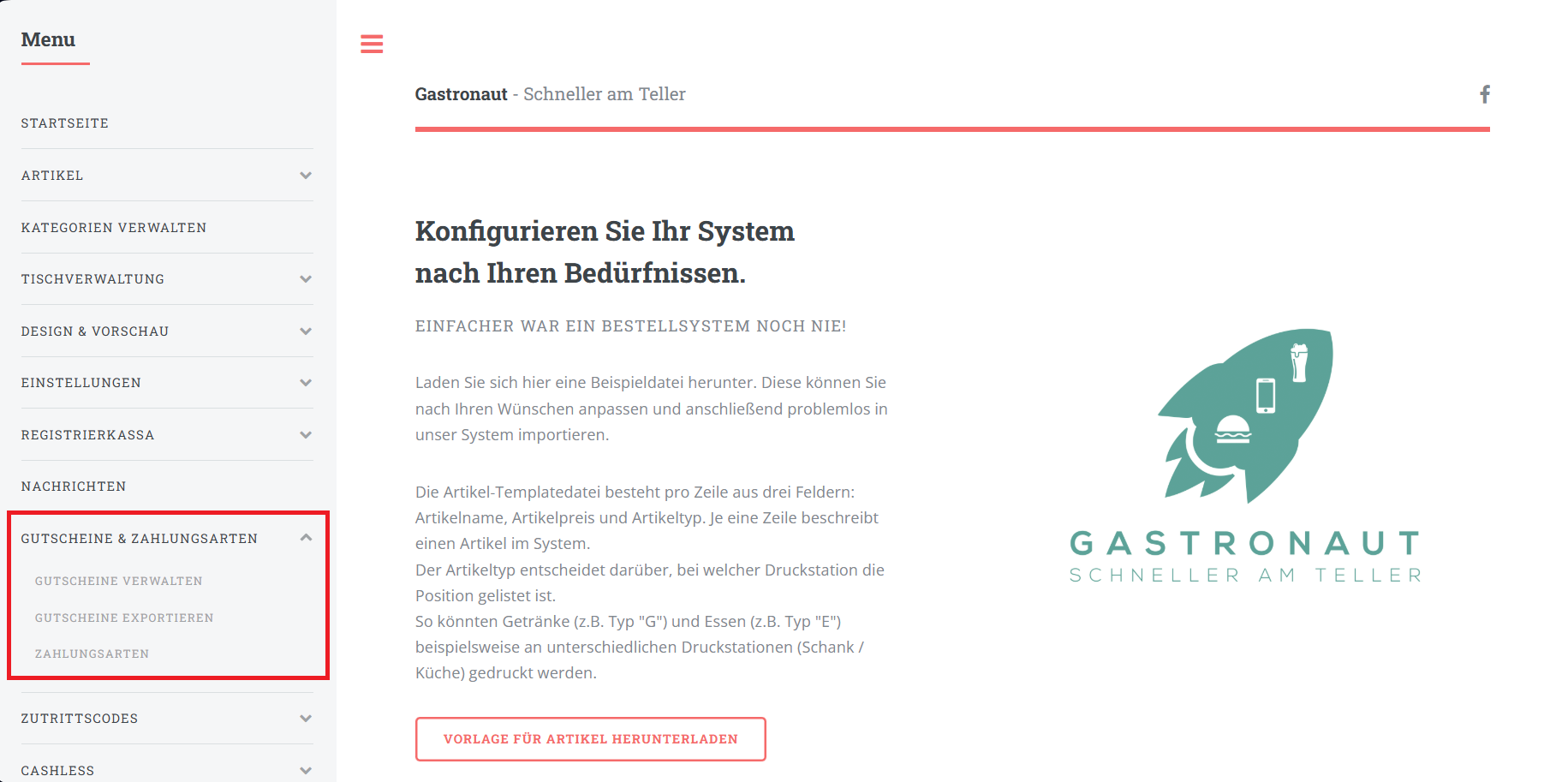 Gutscheine und Zahlungsarten finden Sie in der Navigationsleiste auf der linken Seite: