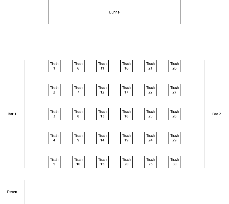 In diesem Beispiel kann man sehen, wie ein Tischplan ausschauen könnte. Der Bühne weisen wir Nummer 31 zu.